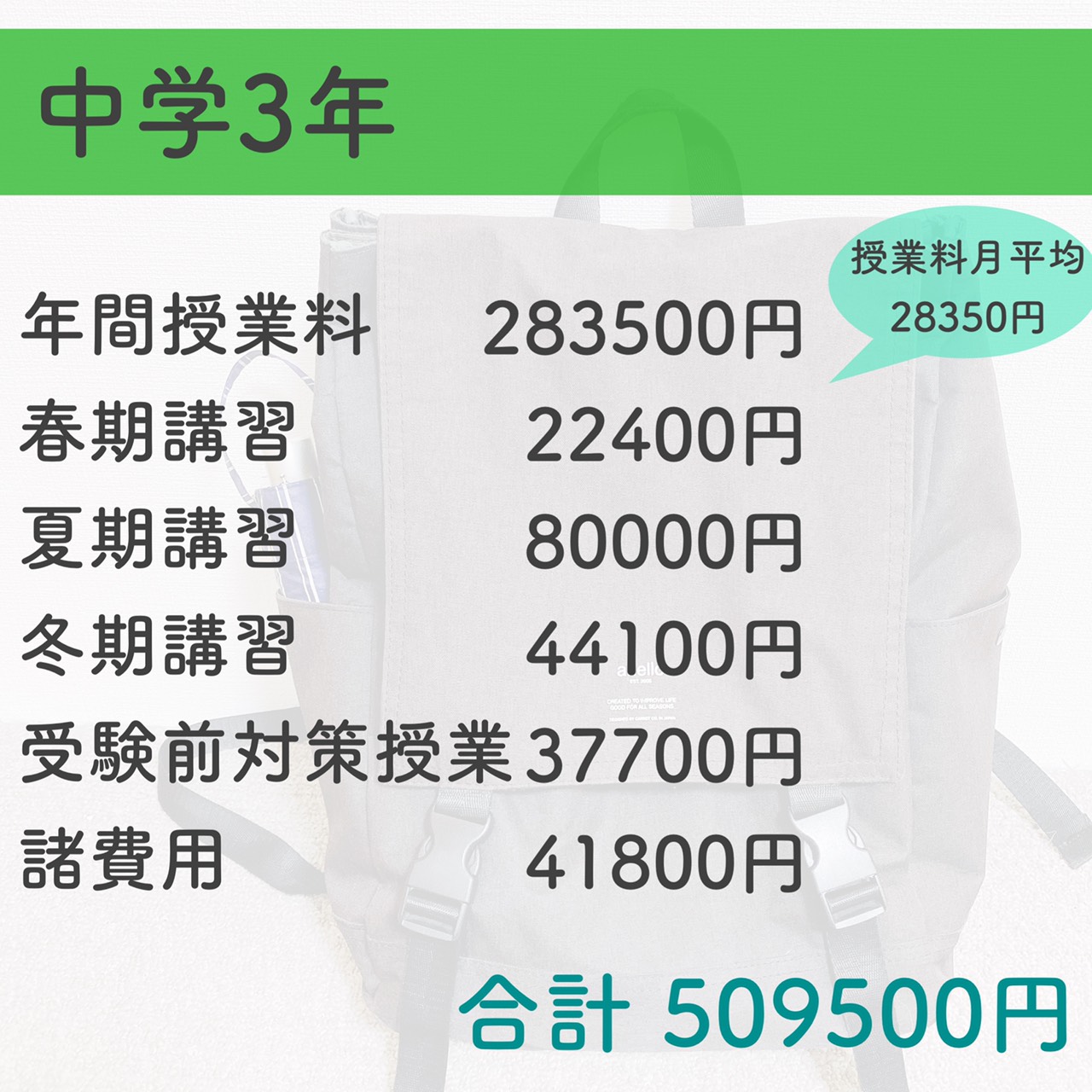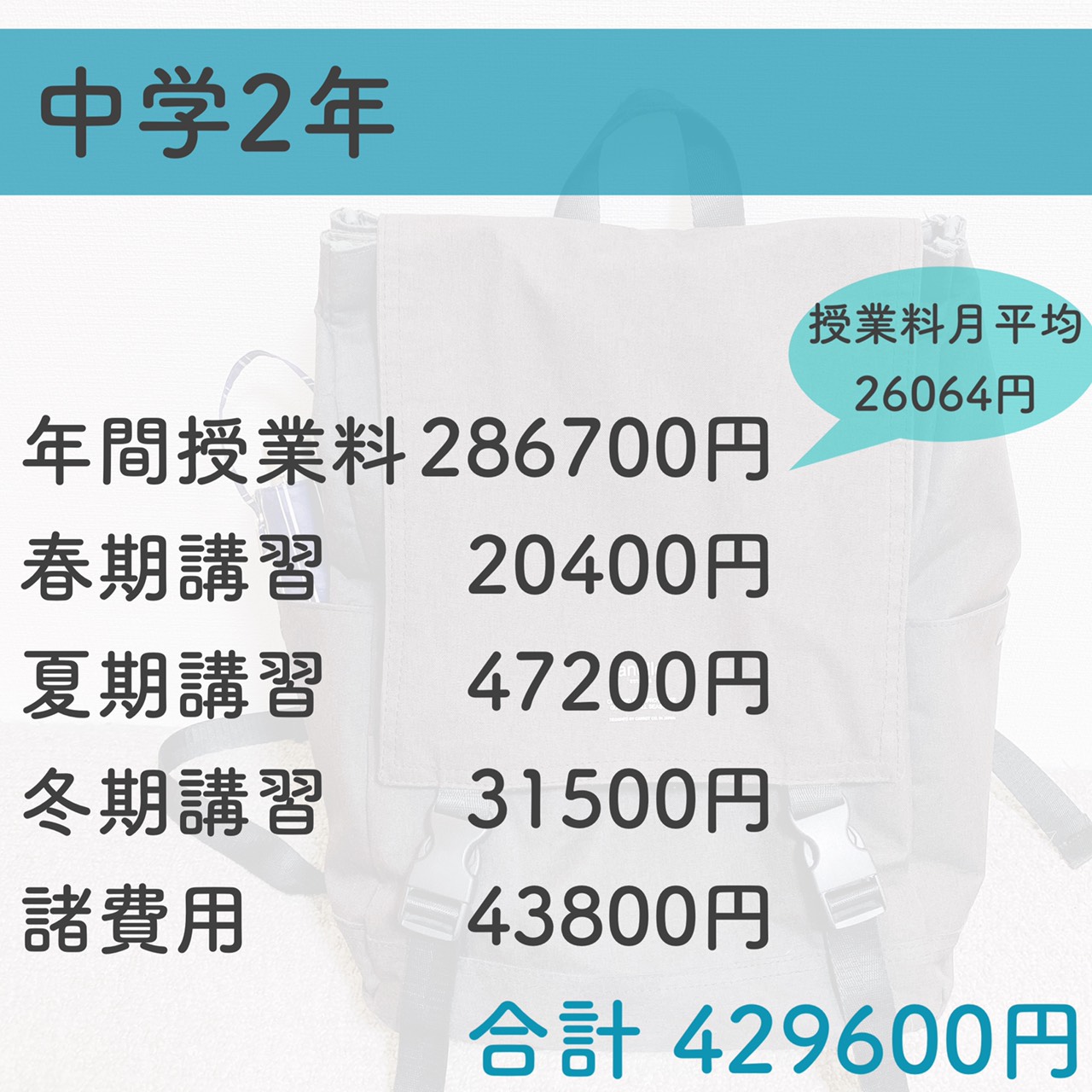 この金額以外にも夏頃から毎月+模試代(希望者のみ)が掛かるので合計で60~70万くらいになる予定です。