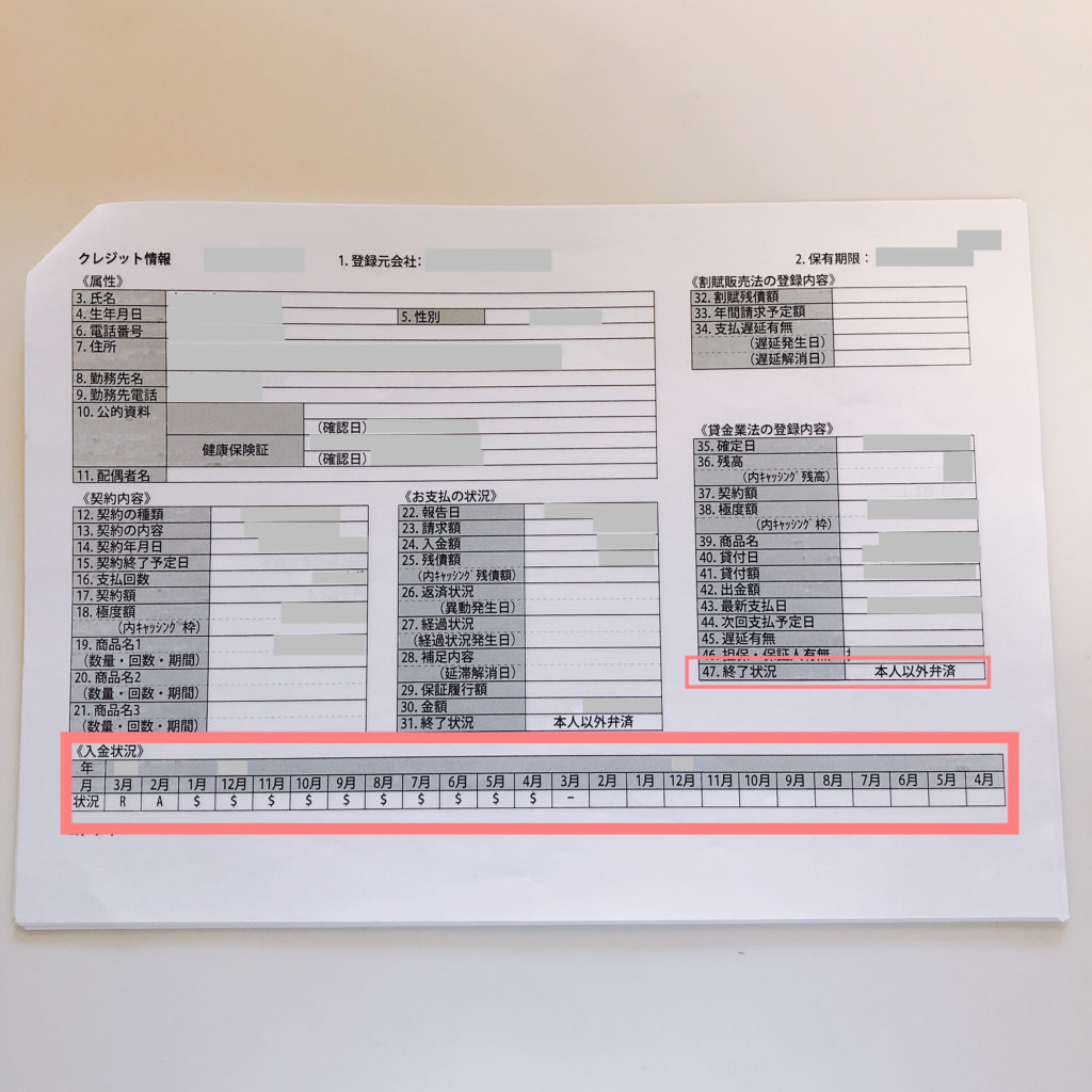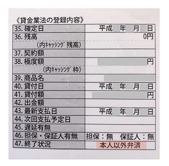 「完了」と「空欄」以外の記載がある場合ブラックという事になります。ちなみに23の【返済状況】に異動と記載されている場合もブラックです。